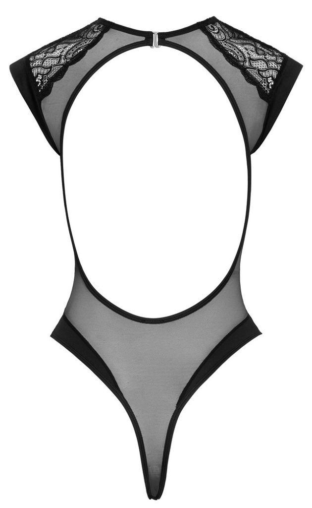 Tento čierny thong body je vyrobený z jemnej kombinácie čipky, priesvitného powernetu a mäkkého mikrovlákna. Materiál je príjemne elastický, krásne prilieha k telu a zabezpečuje maximálny komfort pri nosení. Transparentné prvky pôsobia zvodne, zatiaľ čo nepriehľadné, jemne riasené košíčky s kamienkom medzi nimi dodávajú modelu výrazný detail.